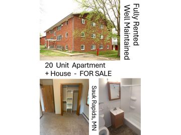 Village View Apartments were well built in the mid 1960's with brick walls and gabled, asphalt shingle roofs. The 21 units are composed of an 8 unit building (117 3rd Ave S), a 12 unit building (107 3rd Ave S) and the house next door (210 1st St). The apartment buildings and house on .92 acre, half block and share an alley with US Bank and an office building. The property is just around the corner from Coborn's Grocery and the bus line. The apartments are good size, comfortable, with good natural light, full bath, eat in kitchen, and large living room and are well located - making them easy to rent. Since 2017, the buildings have been consistently maintained - new roof in 2020, bath floor & closet updates, kitchen repairs, tuck point repair 2023, etc... Current rents are below market and offer the new owner the opportunity to increase cash flow. (See pictures for rent roll and proforma).